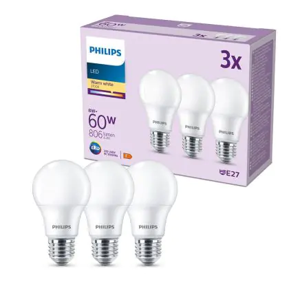 Die Mehrfachpackung 3x Philips Glühbirne LED E27 Birne Matt 8W 806lm - 827 Extra Warmweiß ist eine effiziente E27 LED-Lampe und der perfekte Ersatz für Ihre konventionellen W Lampen mit E27-Sockel. Zudem strahlt sie Licht in der Farbtemperatur 2700K - Extra Warmweiß aus und punktet durch eine lange Lebensdauer.